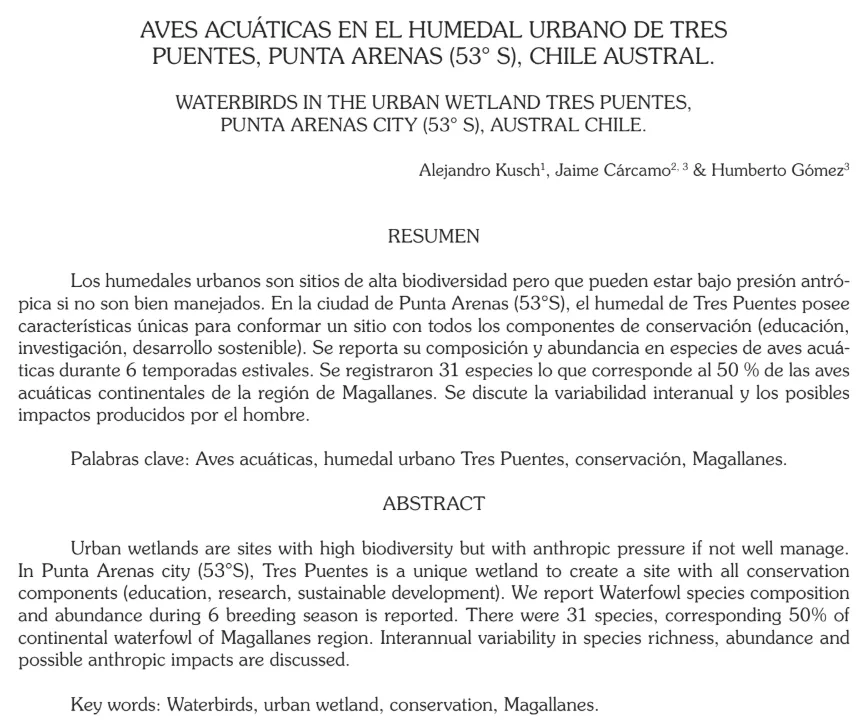 El artículo “Aves acuáticas en el humedal urbano de Tres Puentes, Punta Arenas” destaca la riqueza y diversidad de aves en un entorno urbano de gran importancia ecológica. Durante seis temporadas estivales se registraron 31 especies, representando el 50% de las aves acuáticas continentales de la región de Magallanes, Chile. El humedal, a pesar de la presión antrópica, funciona como un refugio esencial y sitio de alimentación para aves residentes y migratorias. El estudio analiza la variabilidad en la riqueza y abundancia de especies, los impactos de la urbanización y recomienda acciones de conservación y restauración ecológica. Ideal para quienes desean conocer y proteger la biodiversidad local.